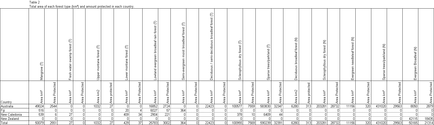 Table showing the total area of each forest type (kmē) and the area of the amount protected in each country.