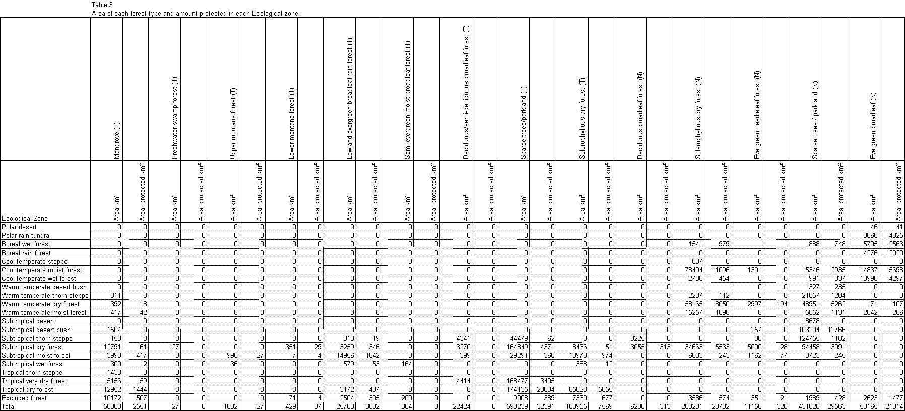 Table showing the total area of each forest type (kmē) and the area of the amount protected in each ecological zone.