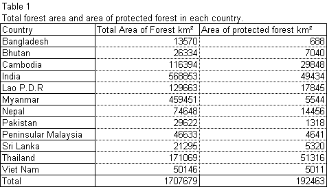 Table showing total forest area (kmē) and the area of the amount protected in each Country.