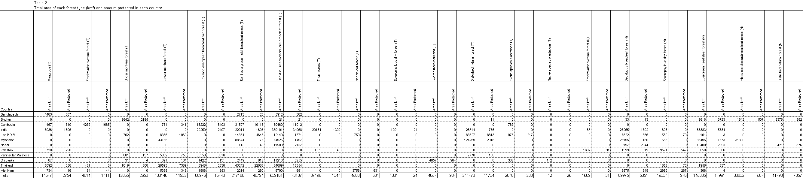Table showing the total area of each forest type (kmē) and the area of the amount protected in each country.