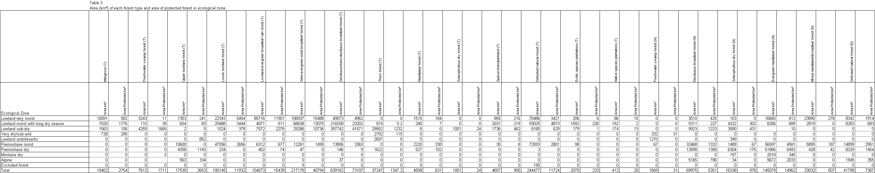 Table showing the total area of each forest type (kmē) in each ecological zone, and the area of the amount protected.