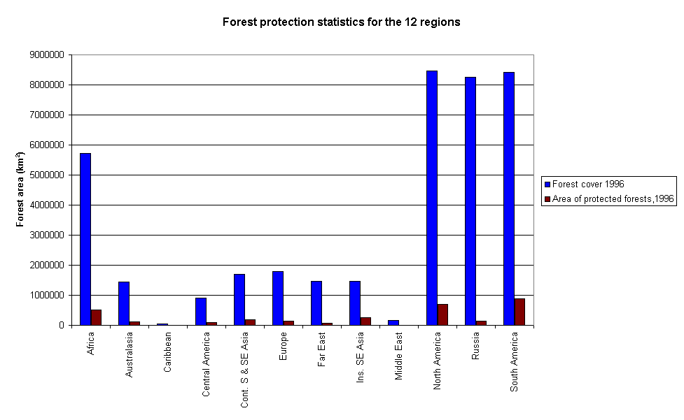 Bar chart showing amount of forest in each region of the globe - with total amount and percentage protected, without world totals.