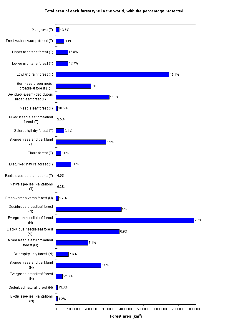 Bar chart showing the amount of each different forest type in the world and percentage protected.