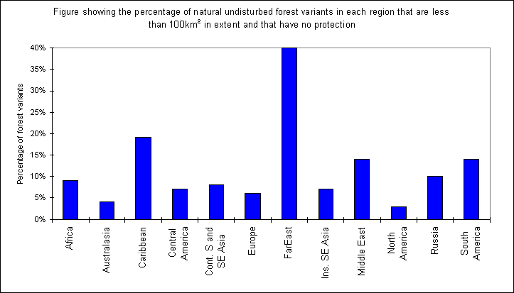 Bar chart showing the percentage of natural undisturbed forest variants in each region, less than 100km2 in extent and that have no protection.
