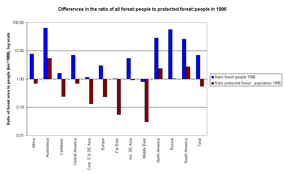 Bar chart showing a comparison of the ratios of forest to protected forest to population in each of the 12 regions of the world (log scale).