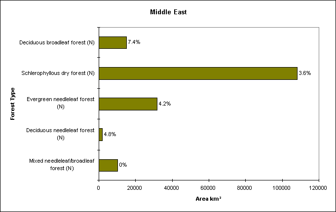 Bar chart showing the total area of each forest type, with the percentage protected written above each bar.