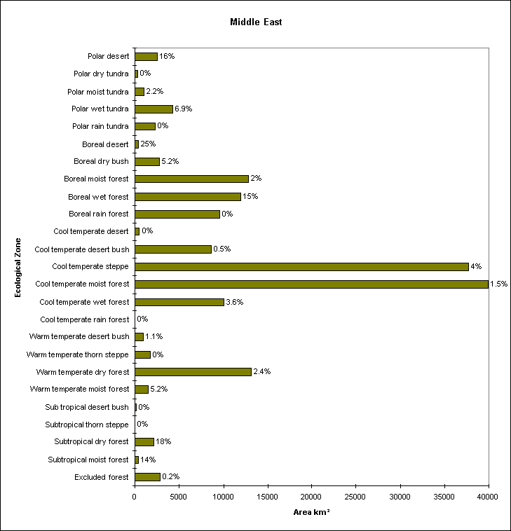 Bar chart showing the total area of forest in each Ecological zone , with the percentage protected written above each bar.