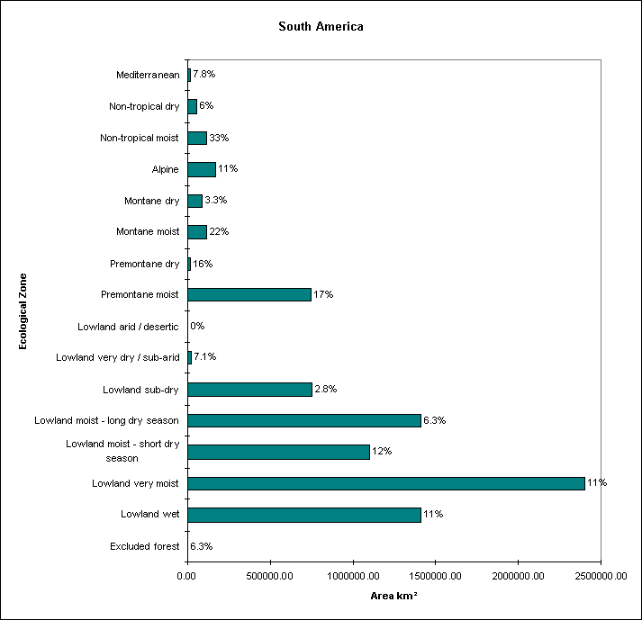 Bar chart showing the total area of forest in each Ecological zone , with the percentage protected written above each bar.