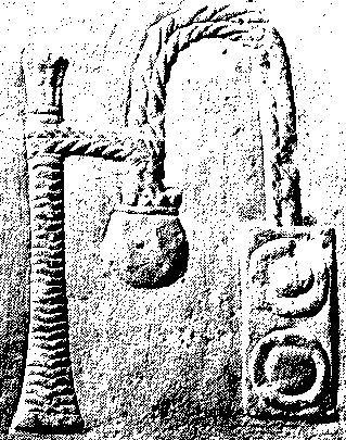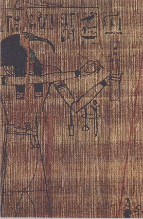 (Diese Hieroglyphe ist auch auf der modernen Papyrus-Rolle oben zu sehen. Eine Darstellung aus der Zeit um 2500 vuZ zeigt diese Details noch deutlicher). In der Darstellung auf dem Papyrus hält der Schreibergott selbst wiederum eine Papyrusrolle in der Hand. [Quelle: Claiborne (1978) S. 39] |