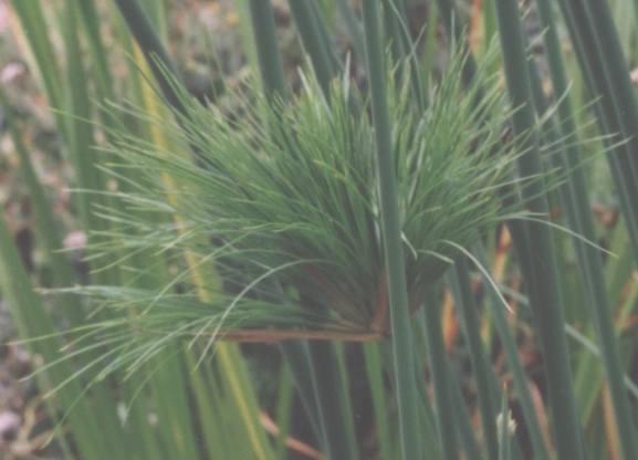 | Blätter | Der Halm ist kahl und an seiner Spitze befindet sich eine schirmartige Krone von Blättern. Diese schopfartige angeordneten Blätter sind fadenförmig ausgebildet und wirken sehr attraktiv (siehe dazu das Foto Papyrus: aufgefächerter Blatt- und Blütenansatz von oben (169 KB; Foto: Boye). |