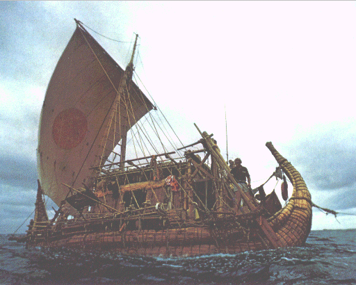 Die Seetüchtigkeit von Papyrus-Booten hat Thor Heyerdal´s RA II (123 KB; Kon-Tiki Museum, Oslo) gezeigt. Damit konnte dieser Forscher den Weg von Nordafrika nach Mittel-Amerika zurücklegen. |