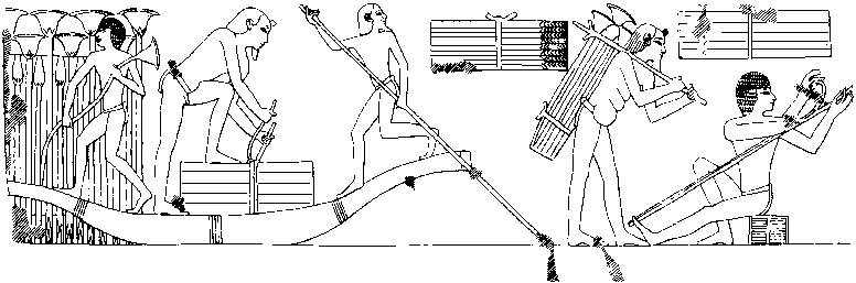 Ägyptische Schiffe aus Papyrus sind auf zahlreichen Abbildungen dargestellt. Sie sind gut an dem ebenfalls als Papyrus-Blütenbüschel gestalteten Heck zu erkennen.