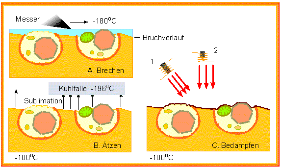 Wasser wird anschließend durch Gefriertrocknung entfernt. Es sublimiert, d.h., es geht von der festen, unter Umgehung der flüssigen, direkt in die Gasphase über. Das Präparat wird dadurch oberflächlich angeätzt. Es folgt nunmehr eine Schrägbedampfung, und der dabei erhaltene Abdruck wird abgezogen und mikroskopiert.