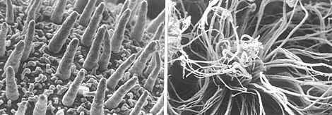 1. Belag aus stäbchenförmigen Kristalloiden auf der Samenschale eines Mittagsblumengewächses (Sceletium, Aizoaseae). Es gibt zwei Typen von Stäbchen: kurze und lange. 2. Fadenförmige Flavonoid-Kristalloide des Blattes einer Mehlprimel (Primulaceae). Fadenförmige Flavonoid-Kristalle dieser Art findet man nur bei bestimmten Primeln sowie bei einigen wenigen Farnen. (W. BARTHLOTT, 1981, W. BARTHLOTT, E. WOLLENWEBER, 1981)