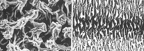 3. Ungewöhnliche Bildung komplexer Wachsstrukturen an der Blattunterseite einer Pflanze des tropischen Regenwaldes (Bellusia pentamera, Melastomataceae). Deutlich erkennbar: freiliegende Stomata. (S. RENNER, 1986 unveröff.) 4. Parallel orientierte Wachsplättchen auf dem Sproß des Spargels (Asparagus) Streng orientierte Wachsplättchen sind ausschließlich auf bestimmte Ordnungen der Monokotyledonen beschränkt und erlauben deren systematische Umgrenzung. (W. BARTHLOTT, 1981, W. BARTHLOTT, E. WOLLENWEBER, 1981)