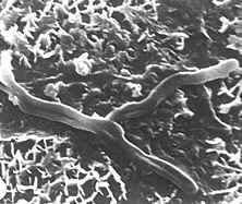 5. Sproßoberfläche von Colletia spec. (Rhamnaceae). Die auffalligen röhrenförmigen Strukturen sind Kamine, an deren Basis stets eine Spaltöffnung liegt. Sie verändern den Gasaustausch bzw. die Transpiration der stark xeromorphen Pflanze südamerikanischer Trockengebiete. 6. Pilzhyphen auf einer Blattoberseite von Prosopsis spec, einer Art aus der Familie der Mimosaceae. Um die Pilzhyphen ist der kristalloide plättchenförmige Wandbelag verschwunden. Der Pilz kann sich nunmehr unmittelbar auf der wachsfreien Blattoberfläche ausbreiten. (W. BARTHLOTT, 1981, W. BARTHLOTT, E. WOLLENWEBER, 1981 W. BARTHLOTT, 1985 unveröff.)