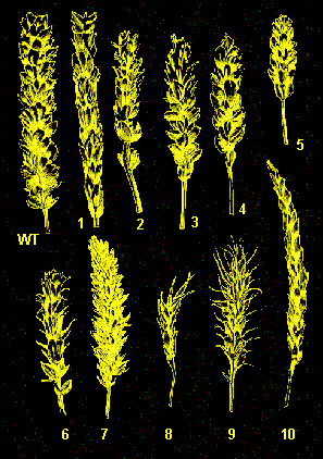 Ährenform des Wildtyps (WT) und von einigen Mutanten, denen einzelne Chromosomenpaare fehlen (Nullisomen). Wegen der Hexaploidie wird das Fehlen eines Chromosomenpaares toleriert, der Effekt manifestiert sich jedoch in unterschiedlicher, meist weniger wüchsiger (reduzierter) Ährenform. (E. R. SEARS, 1953)