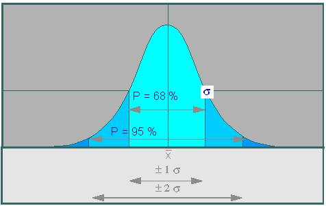 Parameter einer Normalverteilung: Der Wert P bezieht sich auf den Flächenanteil, der durch die Kurve und die Grundlinie zwischen den Werten + und - 1 sigma,(hellblaue Fläche), resp. + und - 2 sigma (hellblaue + mittelblaue Fläche) oder + und - 3 sigma (hellblaue + mittelblaue + dunkelblaue Fläche) eingeschlossen wird.