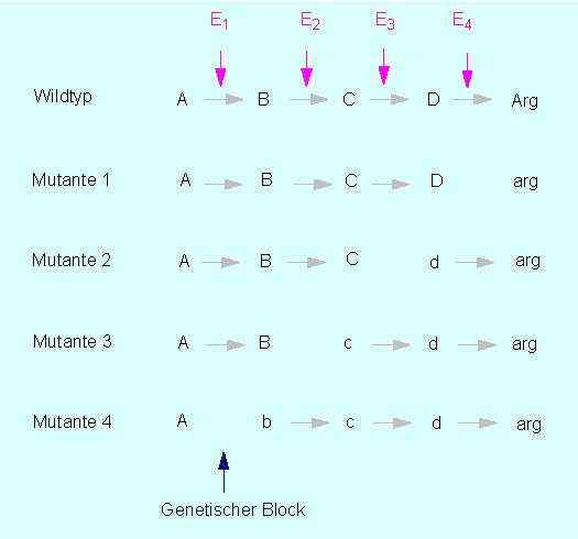Eine Biosynthese (hier die der Aminosäure Arginin) verläuft über eine Anzahl von Zwischenstufen. Beim Wildtyp sind die benötigten Gene (hier 5) vorhanden, die Enzyme E1-E5 werden gebildet und damit auch das Syntheseprodukt Arginin (Arg). Bei den Mutanten 1-4 liegt jeweils ein genetischer Block vor, der die Unterbrechung der Synthesekette nach sich zieht. Es werden Zwischenprodukte (D, C, B oder A) in den Zellen angereichert. Die Zellen können sich nur dann weiterwachsen, wenn ihnen Arginin im Nährstoffangebot zur Verfügung steht (= auxotrophe Mutanten).
