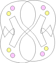 ConA-Tetramer Die Umrisse entsprechen denen der gefalteten Polypeptidkette. Die violetten Kreise symbolisieren Manganbindungsstellen, die gelben die Zuckerbindungsstellen