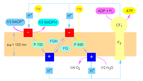 Schematische und vereinfachte Darstellung der Elektronentransportkette und des Photonenflusses in Thylakoidmembranen |