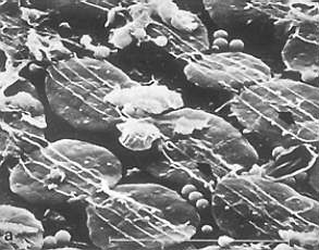 Rasterelektronenmikroskopische Aufnahme von cortical gelegenen Plastiden mit darübergespannten Aktinfilamentbündeln bei Chara |