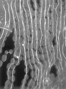 Nachweis von Aktinfilamenten durch indirekte Immunfluoreszenz in Strängen des cortikalen Plasmas von Chara. Die Chloroplasten erscheinen im Bild aufgrund ihrer roten Eigenfluoreszenz grau. (R. WILLIAMSON, 1984).