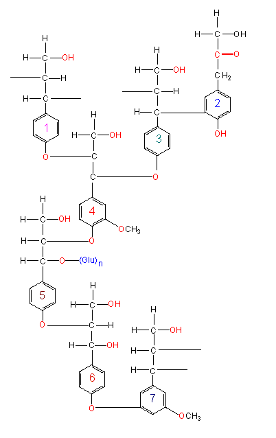 Es besteht vornehmlich aus Coniferylalkoholresten, zu einem geringeren Teil aus Cumarylalkoholresten. Dargestellt ist ein kleiner Ausschnitt aus dem dreidimensionalen Netzwerk dieses Polymers (Nach K. FREUDENBERG und A. C. NEISH, 1968).