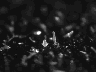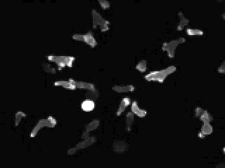 cells filmed through a dark-field macroscope. White bands represent