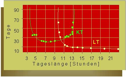 Reaktionen: a. Zeit bis zum Erscheinen der Blütenknospen (bei KT) und b. Zeit bis zum Schoßen (bei LT). (G. MELCHERS und A. LANG, 1948).