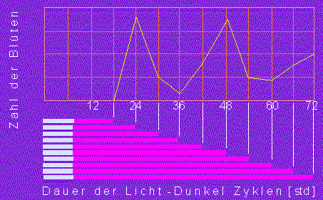 Die Sojabohne wurde in Zyklen von 10 Stunden Licht und 8-62 Stunden Dunkelheit gehalten. Ordinate: Zahl der Blüten. Die Maxima liegen bei 10 Stunden Licht und 14 Stunden Dunkelheit, sowie bei 10 Stunden Licht und 30 Stunden Dunkelheit (Hellphase durch hellblaue, Dunkelphase: durch rotviolette Balken gekennzeichnet). Die Abstände auf der Abszisse entsprechen 6-Stunden - Zeitintervallen.