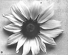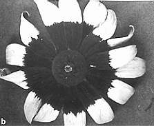 Jede Farbe wirkt als ein spezifisches Signal. Die spektrale Empfindlichkeit des Insektenauges (speziell des Bienenauges) unterscheidet sich von der des menschlichen Auges. Bienen nehmen ultraviolettes Licht wahr, sie erkennen langwelliges Licht des (für den Menschen) sichtbaren Bereichs (Rotbereich) nicht. Die Blüten vieler Pflanzenarten zeichnen sich durch sogenannte UV-Male aus, die von Bienen, aber nicht vom Menschen erkannt werden. Durch spezielle optische Tricks lassen sich auch solche Muster abbilden. links: Blütenköpfchen einer nordamerikanischen Composite: Rudbeckia bicolor (auch in europäischen Gärten angebaut: "Sonnenhut", gelegentlich verwildert). Auf konventionelle Art photographiert: mit normalem Filmmaterial und Standardobjektiv. rechts: gleiches Objekt mit einer Quarzoptik und einem Sperrfilter (Rubinfilter), der sichtbares Licht zurückhält, aufgenommen. Verwendet wurde zudem ein ultraviolett-empfindlicher Film. Dadurch wird die Ultraviolett-Zeichnung des Blütenköpfchens sichtbar. (W. BARTHLOTT, 1986)