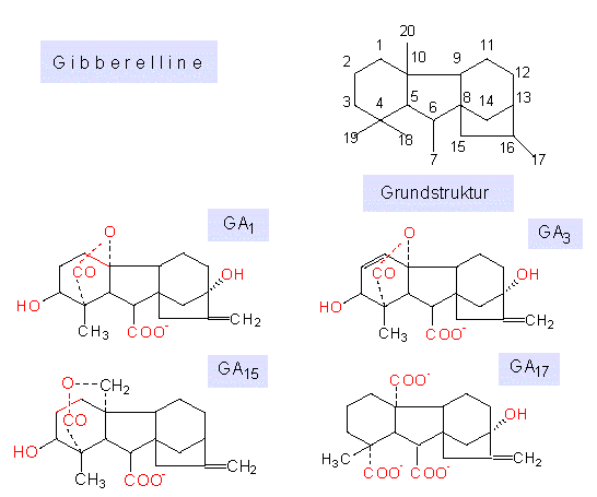 Gibberelline sind Diterpene, sie enthalten vier Isopreneinheiten, die zu einem Viererringsystem verbunden sind. Man unterscheidet zwischen den Gibberellinen mit 19 und solchen mit 20 C-Atomen. Das 20. C-Atom ist nicht Bestandteil eines der vier Ringe, sondern Teil einer Seitenkette (CH3 in GA12, CH2OH in GA15, CHO in GAl9 oder COOH in GA28). An dieser Aufzählung und den Beispielen in der Abbildung wird deutlich, in welcher Hinsicht sich die einzelnen Molekülstrukturen voneinander unterscheiden.