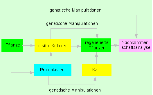 Unter in vitro - Kultur können Kalluskulturen, Embryokulturen, Antherenkulturen u. a. verstanden werden. Genetische Manipulationen im klassischen Sinne bedeutet z. B. Mutagenese, Polyploidisierung u. a. Heutzutage kommen gentechnische Verfahren hinzu. Unter Nachkommenschaftsanalyse versteht man die Selektion der gewünschten Genotypen (H. LÖRZ, 1986)
