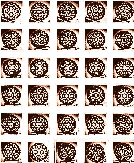 Dreißig verschiedene Orientierungen. Die Darstellung dient der Demonstration, daß man bei elektronenmikroskopischer Betrachtung von leeren Hüllen ikosaedrischer Viren (z. B. Turnip Yellow Mosaik Virus) nach dem Negative-staining-Verfahren mit einer großen Zahl von Formen zu rechnen hat, da die Partikel in allen Orientierungen zu sehen sind und sich zudem Vorder- und Rückenseitenmuster überlagern (J. FINCH und A. KLUG, Cambridge, 1966)