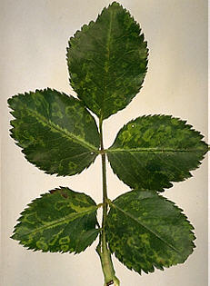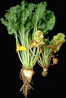 Prunus necrosis ringspot virus auf dem Blatt einer Rose; Rhizomania bei Zuckerrüben (links gesunde, rechts infizierte Pflanze)