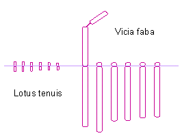 Unterschiedliche Chromosomengröße (= unterschiedliche DNS-Mengen) bei zwei Arten aus der Familie der Leguminosen (Nach G. L. STEBBINS, 1971).