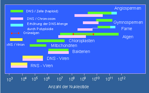 DNS-Mengen pro Zelle, respektive Organell. Bei einigen Viren: RNS-Mengen. Mit zunehmender Evolutionshöhe ist eine Zunahme an DNS zu verzeichnen. (Nach A. H. SPARROW, H. J. PRICE, A. G. UNDERBRINK, 1972).