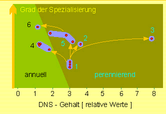 Arten mit viel DNS sind daher in Gebieten mit einer kurzen Vegetationsdauer "notgedrungen" perennierend. Umgekehrt beruht perennierende Lebensweise nicht unbedingt auf großer DNS-Menge, denn es gibt durchaus perennierende Arten mit nur sehr wenig DNS.