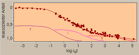 Die im Experiment eingesetzten Fragmente sind etwa 300 Basenpaare lang. Die Meßwerte sind als Punkte wiedergegeben. Auf der Ordinate ist die realive optische Dichte aufgetragen, auf der Abszisse der log cot (= Konzentration x Zeit; co ist die Konzentration der Einzelstränge zum Zeitpunkt t = 0). Aus den Werten lassen sich die im unteren Teil des Bildes dargestellten Anteile von repetitiven, intermediär repetitiven und singulären Sequenzen ermitteln (Nach M. G. MURRAY et al., 1978)