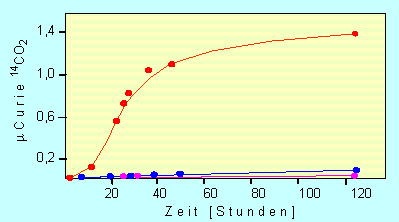 Die katalytische Aktivität eines Proteinoids. Gemessen wurde die Dekarboxylierungsrate von Brenztraubensäure (Pyruvat) in Anwesenheit eines Proteinoids (rot), eines Gemisches aus freien Aminosäuren (blau) und ohne irgendwelchen Zusatz (magenta)