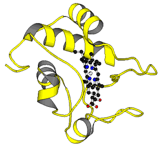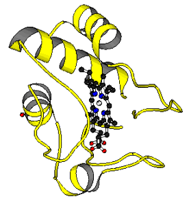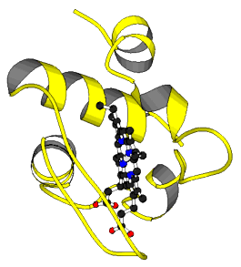 Links: Prokaryotisches Cytochrom c (Modell auf der Grundlage der Untersuchungen an Cytochromen aus den Bakteriengattungen Pseudomonas und Chlorobium). Rechts: Cytochrom c2 aus der Elektronentransportkette der Photosynthese von Rhodospirillum rubrum.