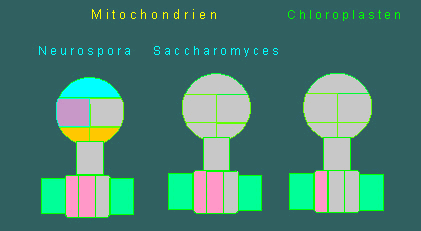 Die Abbildung zeigt, daß die Untereinheiten von ATP-Synthetasen unterschiedlicher Herkunft durch unterschiedlich lokalisierte Gene codiert werden . Von links nach rechts: Mitochondrien von Neurospora von Saccharomyces sowie von Chloroplasten; farbig: organellencodiert, grau: kerncodiert) Der Befund belegt, daß es im Verlauf der Evolution einen Genaustausch zwischen den einzelnen Kompartimenten gegeben hat.