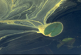 Durch Wind verbreiteter Pollen von Pinus auf einer Wasseroberfläche (Neben einem Seerosenblatt)