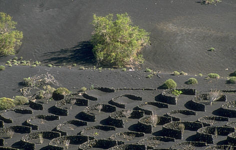 Vitis vinifera: Weinrebe: Anbau auf der Kanarennsel Lanzarote. Die Pflanzen werden einzeln in Trichtern aus Lavaasche kultiviert. Die von der Lava absorbierte Luftfeuchtigkeit genügt, um den Wasserbedarf der Pflanzen zu decken
