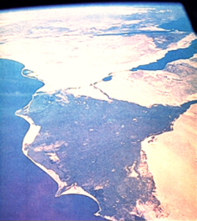 Nildelta und Sinai-Halbinsel. Deutlicher als auf einem solchen Satellitenphoto kann der Kontrast zwischen bewässertem Land (hier einem der ältesten menschlichen Siedlungsräume) und umgebender Wüste wohl nicht sichtbar gemacht werden. (NASA S-65-34 776, Gemini IV, Juni 1965). Das zweite Bild zeigt künstlich bewässerte, landwirtschaftlich genutzte Flächen am Salton Sea (in der Anza Borego im Süden Kaliforniens). Die Aufnahme wurde mit einer Infrarotkamera aufgenommem (NASA)