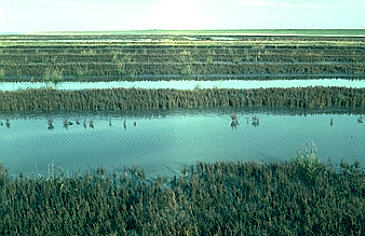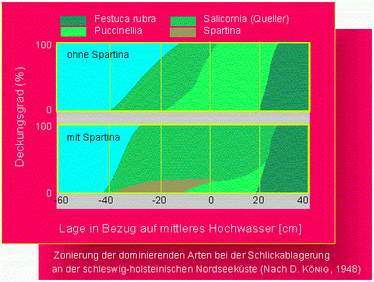 2. Die Verdrängung von Arten nach Einführung einer weiteren läßt sich am Beispiel der Ausbreitung von Spartina townsendii an der Nordseeküste demonstrieren. Diese Art, in der zweiten Hälfte des letzten Jahrhunderts an der englischen Küste entstanden, wächst am Rande der Gezeitenzone in einem Bereich, den sich üblicherweise zwei andere Arten teilen. Die durch Gezeiten regelmäßig überflutete Zone wird vom Queller (Salicornia europaea) besiedelt; in der nur sporadisch (durch Spring- und Sturmfluten) überfluteten und durch Sedimentablagerung höher liegenden Zone ist der Andel (Puccinellia maritima), eine narbenbildende Grasart, dominierend. Eine dritte, ich landeinwärts anschließende Zone ist bereits relativ artenreich, der Rotschwingel (Festuca rubra) ist die vorherrschende Charakterart. Wie die nachfolgende Abbildung zeigt, gedeiht Spartina townsendii sowohl in der Salicornia- als auch in der Puccinellia-Zone.
