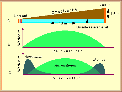 1. Die drei Gramineenarten Alopecurus pratensis, Arrhenatherum elatius und Bromus erectus zum Beispiel sind (wie die übrigen Pflanzen) auf eine bestimmte Menge an Grundwasser angewiesen. Experimentell ließ sich zeigen, daß alle drei Arten bei einer mittleren Grundwassermenge am besten gediehen. In Mischkultur hingegen kommen Alopecurus pratensis und Bromus erectus in diesem Bereich nicht zum Zuge, da die Konkurrenz durch Arrhenatherum elatius zu groß ist.