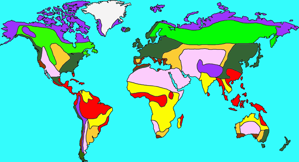 Die acht wichtigsten Biome (Vegetationszonen). rot: Tropischer Regenwald, gelb: Tropische Savanne, hellviolett: Wüsten, braum: Zone Mediterraner Hartlaubgewäche, dunkelgelb: Grasland, Prärie, dunkelgrün: Sommergrüne Laubwälder, hellgrün: Boreale Nadelwaldzone, blauviolett: arktische und alpine Tundra