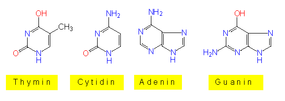 Auch in der Zelle gibt es Aldehydgruppen in den verschiedensten Molekülen, z.B. in Zucker. Es gibt keine freien Aldehydgruppen in der DNS. Die Zuckermoleküle (Desoxyribose), die in die DNS - Struktur eingebaut sind, liegen in geschlossener Ringform vor, die am ersten C-Atom mit einer der vier Basen (Adenin, Thymin, Guanin oder Cytosin ) verbunden sind, deren Reihenfolge die DNS ihre biologische Spezifität verdankt. In den einander komplementären Strängen stehen sich die Basen A und T, sowie C und G gegenüber, sie sind einander komplementär, die Basenpaare werden durch zwei, bzw. drei Wasserstoffbrücken zusammengehalten. Bevor die Zelle mit Schiffschem Reagenz angefärbt wird, müssen also alle kleineren Moleküle mit Aldehydgruppen aus der Zelle entfernt werden und die Aldehydruppen der Zuckermoleküle in der DNS freigesetzt werden.
